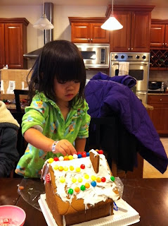 Sunday night, Day 7 is almost done. Hopefully this will be the last day of bed rest. It was another night of not sleeping til almost 5am last night. So the fact that Naomi didn't wake up til 8:30 this morning was a nice treat. Another nice treat was the fact that she happily came into our room and watched videos on Austin's iPad til almost 10am. After that, we got up and made a gingerbread house together. Yes cheating bed rest again, but I figured it was restful since I was sitting the whole time, and I really needed something to get me in the holiday mood. We used a pre-packaged Target gingerbread house that Austin picked up one day after work. It was GHETTO. My goal next year is to make my own, but yea, I just didn't have time this year. Anyway, despite the fact that the roof top started sliding down, and one of the walls eventually caved in, we had a blast. Naomi loved licking the artificially sweet, almost cardboard like, icing, and snuck in probably one too many gum drops. She also took over all decorations as soon as we were done icing the rooftops. I'll post a final picture later, I think Austin snapped some on his iphone. Her decorations are meticulous. She likes to line her toys up in a straight row, so the candy pieces were no different. One note of caution, if you are coming to our house in the next couple of days, DO NOT try to eat the candy. Several pieces were accidently dumped on the floor, and possibly licked by Lilo and Stitch...so umm yea, we decided this was just a gingerbread house to look at =)
